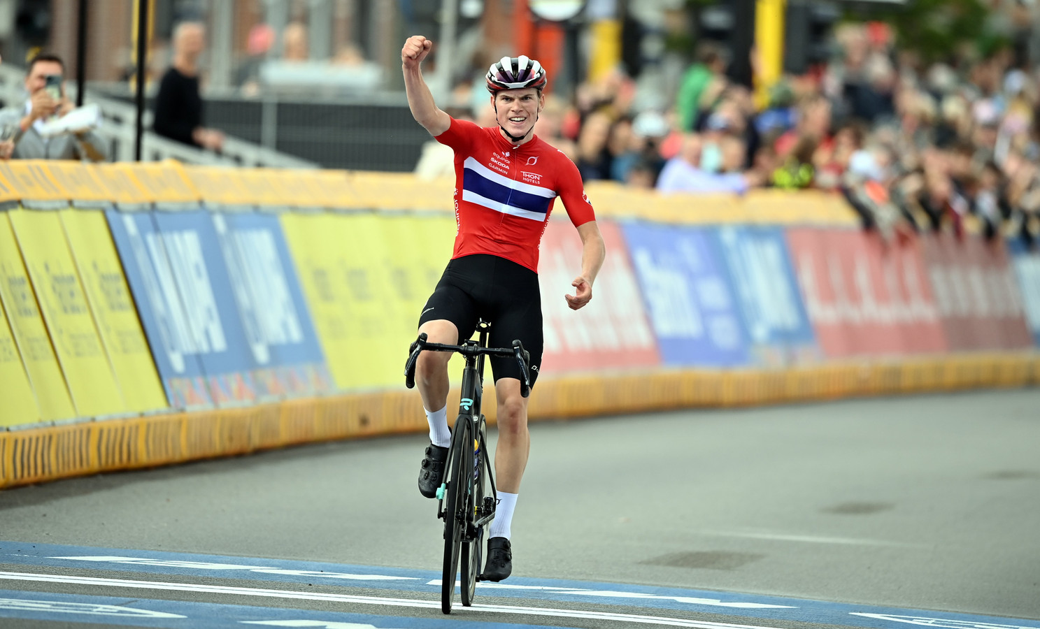 De 18-jarige Noor die volgend jaar zal uitkomen voor de opleidingsploeg van Jumbo-Visma viel aan op de Wijnpers en kwam na een solo van enkele kilometers als eerste over de streep.